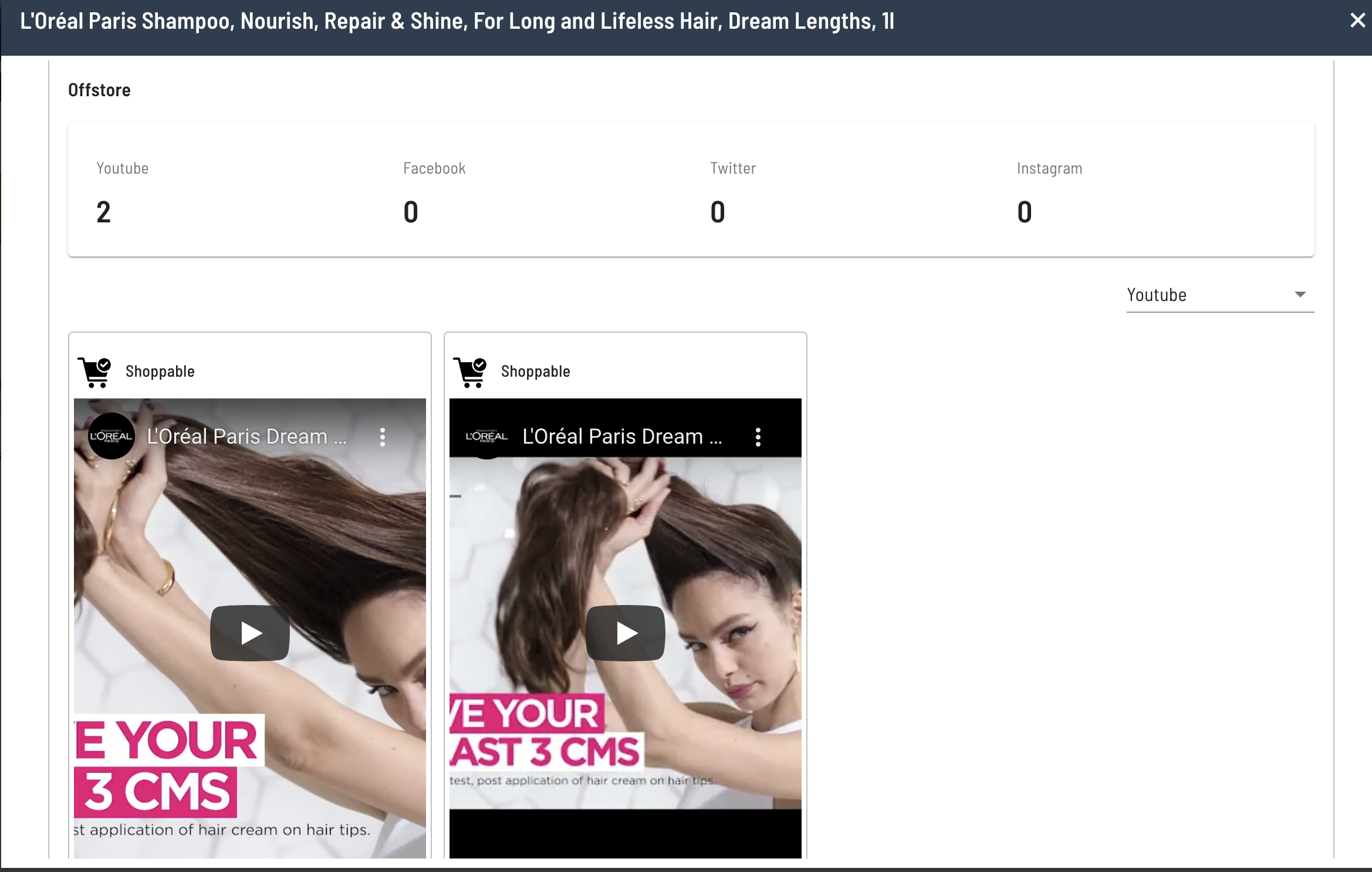 Offstore - Preview the inspirations in which the product got promoted on various social media platforms. This will help with preview of inspirations across all platforms and hence product card becomes a wrapper where we can compare the sales trend of promoted products.