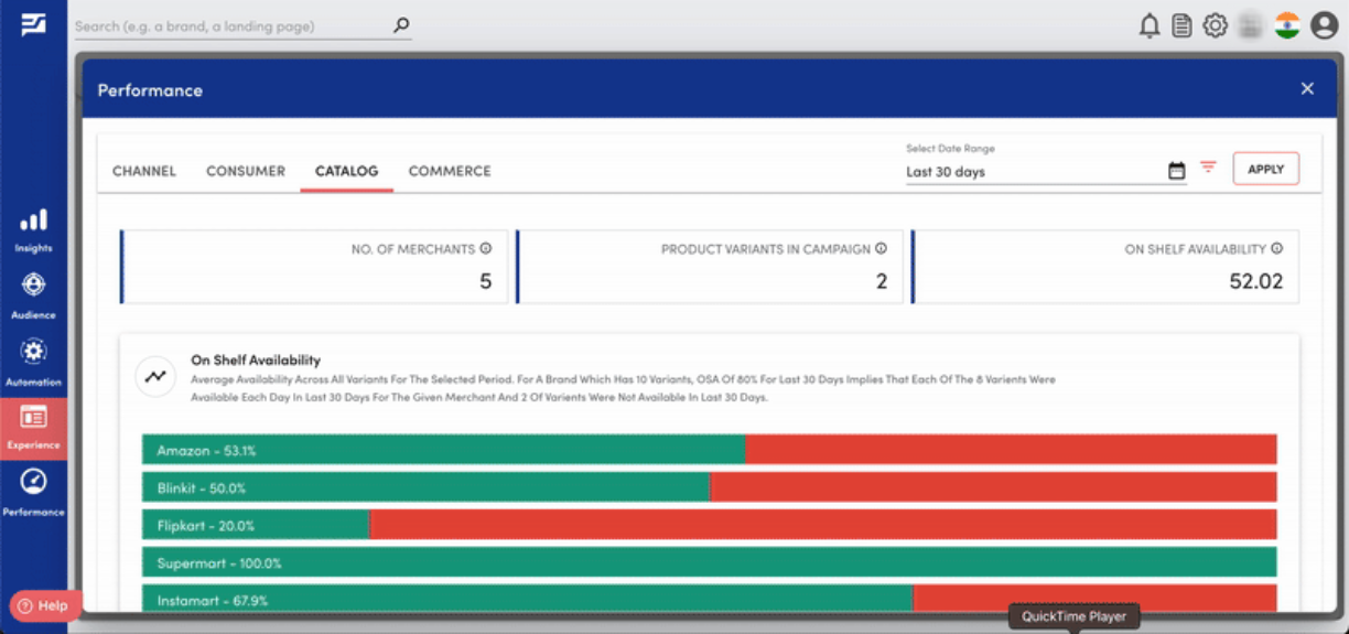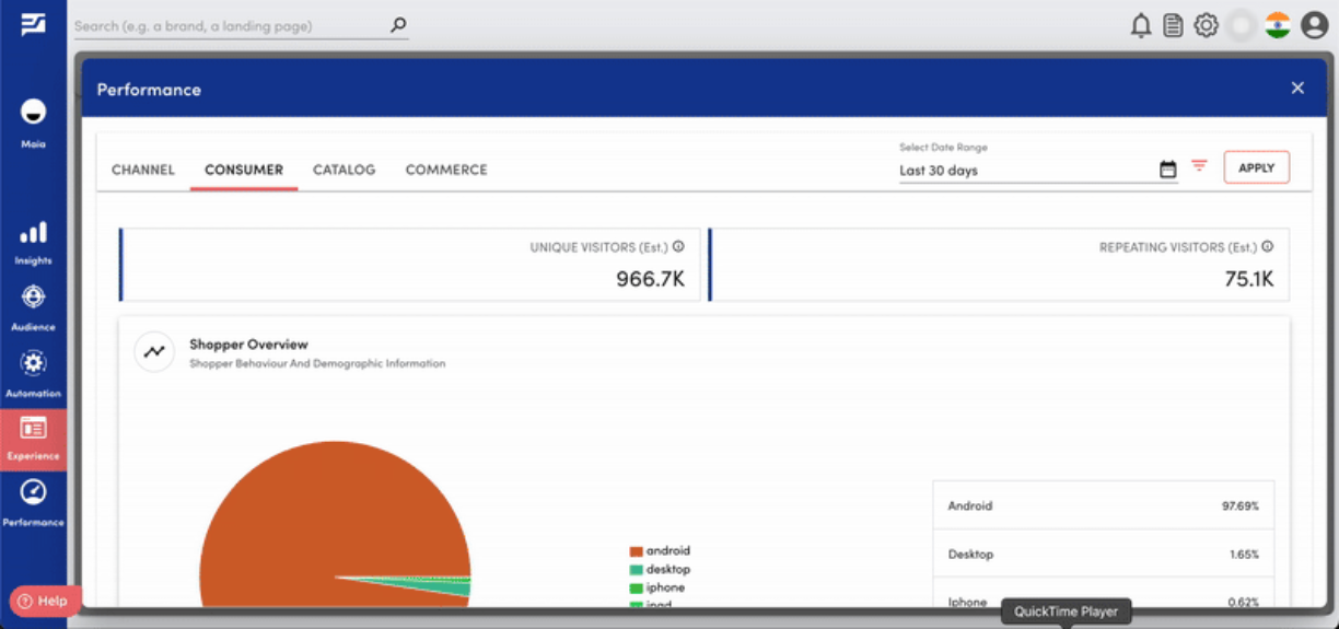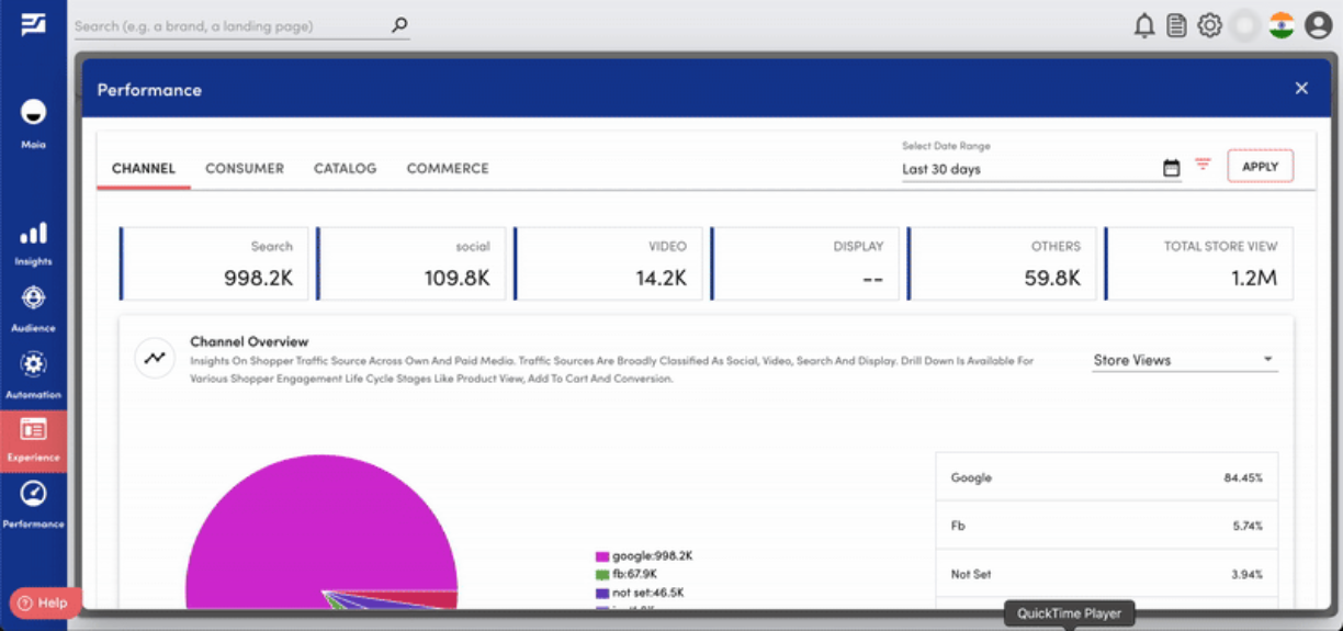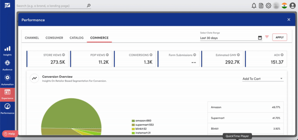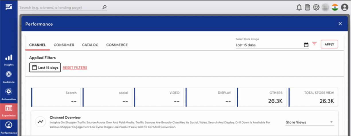 Experience Builder reports on 4 key dimensions i.e. Consumer, Channel, Catalog & Commerce, and each of these offers you insights on factors that influence consumer engagement and sell-through. Each dimension below provides important metrics and insights into your user actions on the landing page.