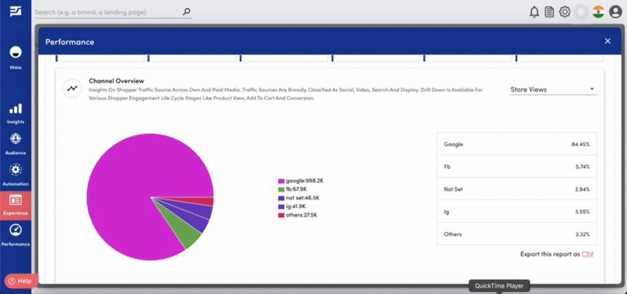 Here you can get Insights on traffic sources across Channels. Further drill down is available for various shopper engagement life cycle stages like Product View, Add To Cart, and Conversion. You can export the report as CSV file.