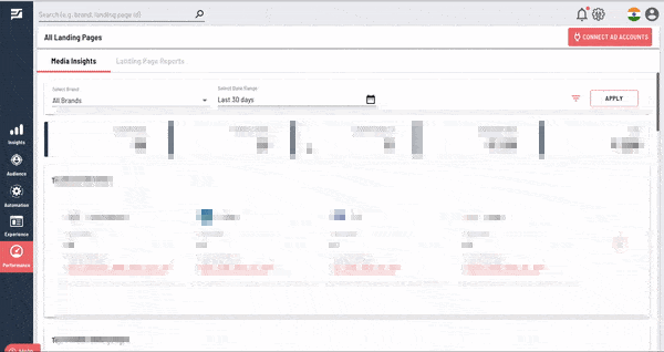 The "All landing page" app provides you with the data in two different dashboards for all your landing pages, i.e. Media Insights & Landing Page Reports.