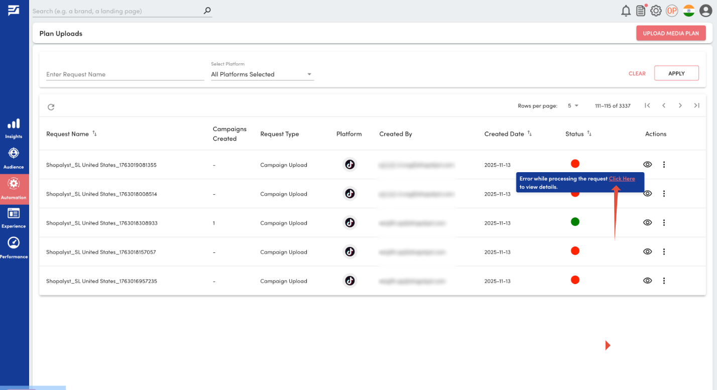 If your upload fails to create or edit the campaigns, the status bar will turn red, and when you hover over the status, a small window will appear, giving you the option to explore the reasons for the failure.